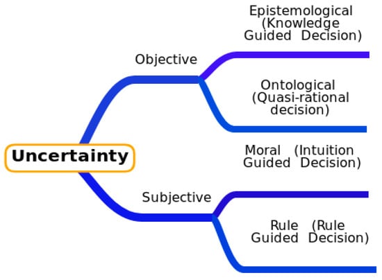 There are different kinds of taxonomies that have been proposed across disciplines to classify them []: Specific taxonomies of uncertainty can be found for various given areas, such as biology [], health [] and trading regulations []. A very general taxonomy is presented by the New World Encyclopaedia entry on uncertainty [] (Figure 2). The difference between epistemological and ontological uncertainty was taken into account when devising our own taxonomy.