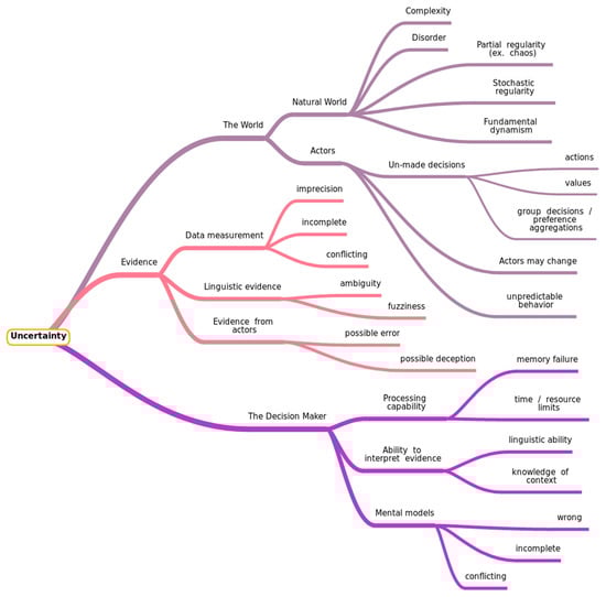 Lovell [], in an extended digression on the topic, presents a detailed compilation of uncertainties of all sources (Figure 5). In this view, which adds another aspect to the previous one, uncertainties can be originated in (i) the world itself, (ii) the empirical evidence and (iii) the human subjects that interpret them (decision makers).