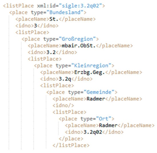 Looking first at the overall number of entries in Table 1, we noted a striking difference in size between the two data collections, with the MySQL database containing considerably fewer entries than the XML/TEI data. As regards different parameters contained in each entry, some, but not all, were relevant for our current context and analysis. Thus, we here concentrate on a sub-set of specific linguistic, spatial and temporal parameters only, and provide an overview of the total number of entries in each of the two data sets, as well as the number of unique (i.e., non-repeated) entries (Table 1, column 1). The specific linguistic parameters concern headwords/lemmas with the following distinction: original mainlemmas (i.e., headwords transcribed in its original form with special characters, e.g., (zu{o)t-aufen), normalized mainlemmas (i.e., headwords transcribed without special characters, e.g., zuotaufen), original additional lemmas (e.g., (Winkel)êe), normalized additional lemmas (i.e., additional headword transcribed without special characters; e.g., Winkelêe) and entries with no lemmas. The specific spatial parameters on the other hand are: Bundesland (county; e.g., Steiermark/St.), Großregion (big region; e.g., mittelbairische Obersteiermark/mbair.Obst.), Kleinregion (small region; e.g., Erzberger Gegend/Erzbg.Geg.), Gemeinde (municipality; e.g., Radmer), Ort (location; e.g., Radmer) and entries without a given location. The distinction between the different types/sizes of regions were made according to an internally developed system of identifiers for regions, so-called sigles, consisting of a letter–number combination and denoting a hierarchical structure, as can be seen in Figure 8.