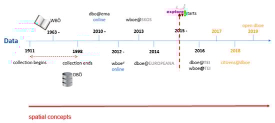 Timeline of the data transformation process relative to the beginning of the exploreAT! project. Image: Amelie Dorn, Eveline Wandl-Vogt, 2018.