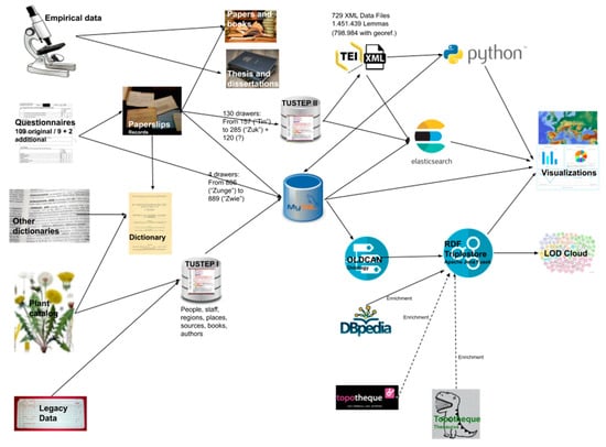 During the turmoil of World War II, the collection suffered some notable losses, and thus the precise quantitative overview of the original material can only be speculated. In the first stage of digitization (1993–2011), all available information noted on the paper slips (including, for example, headword, meaning, pronunciation, location, date and collector name) was manually entered by several data typists into TUSTEP (Tuebinger System von Textverarbeitungs-Programmen/Tuebingen System of Text Processing tools), resulting in ~2.43 million entries. Additionally, auxiliary databases, persons databases, a literature database, a plant name database and location data were also created in TUSTEP. Towards the end of this first digitization process (2007), part of these TUSTEP data were transferred to a MySQL database as part of the dbo@ema project []. For the first time, different separate databases were joint; a geographic visualization interface (maps) and GIS locations were added, and information and data were made publicly accessible and visible on the Internet via a project website []. From then, the heterogeneity of the data increased again, with parts of the original data being still available in TUSTEP, another part having been converted to MySQL and additional newly digitized data being directly entered in MySQL. Following the dbo@ema project, the next step marked the transformation process towards the networked, open data realm. The conversion process of the remaining TUSTEP data to XML/TEI format was one of the first endeavours in exploreAT!, starting in 2015. Data entered in MySQL, however, remained unaltered at first. In the course of exploreAT!, the MySQL data and some of the XML/TEI data were converted to RDF and linked to the Linked Open Data (LOD) Cloud (2017–). In addition, the data is currently in the process of being enriched with lexical concepts and linked to DBpedia concepts. Figure 9 and Figure 10 show an overview of the data transformation process.