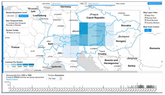 - Benito, A.; Losada, A.G.; Therón, R.; Dorn, A.; Seltmann, M.; Wandl-Vogt, E. A Spatio-temporal Visual Analysis Tool for Historical Dictionaries. In Proceedings of the Fourth International Conference on Technological Ecosystems for Enhancing Multiculturality, Salamanca, Spain, 2–4 October 2016. [Google Scholar]