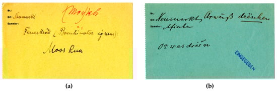 A typical example of this kind of source of uncertainty is, for the DBÖ spatial data, a somewhat common historical region in the far north west of Bohemia in the Czech Republic at the border with Germany, called “Egerland”. It was characterised by the German-speaking population until 1945 (cf. []), but now the names of the places in this region have all changed. Other common cases for this collection are regions that used to belong to Austria but are now in a different country, such as “Stilfs-Stelvio, Vinschgau” that are now “Val Venosta, BZ, TAA, 39,029 in Italy”, or “Groß Olkowitz” that are now “Oleksovice” in the Czech Republic. Some of these examples are presented in Figure 16, together with their original, corresponding paper slips.