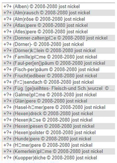 - Reichel, S. Handbuch zum Zeichensatz SMFTeuthonista. 2003. Available online: https://web.archive.org/web/20040724105759/http://www.sprachatlas.phil.unierlangen.de/materialien/Teuthonista_Handbuch.pdf (accessed on 28 June 2019).