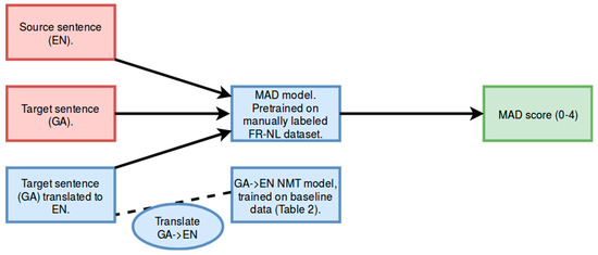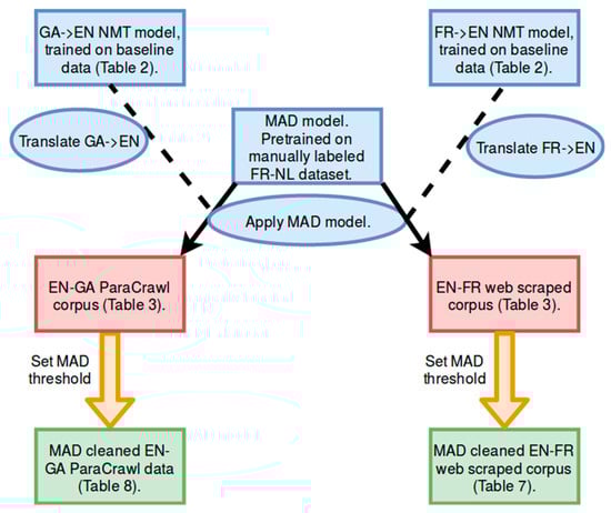 For evaluation of MAD, a web-scraped corpus was used for each language pair (EN–FR, EN–GA). For EN–FR, we scraped and aligned data ourselves from various bilingual websites related to the legal domain. This data was scraped using Scrapy (https://scrapy.org) and then documented aligned using Malign (https://github.com/paracrawl/Malign), a tool for document alignment that makes use of MT. Sentence alignment of these document pairs was subsequently performed using Hunalign (http://mokk.bme.hu/en/resources/hunalign) [24]. More details are provided in References [25]. For EN–GA the raw ParaCrawl data (https://paracrawl.eu, https://s3.amazonaws.com/web-language-models/paracrawl/release3/EN–GA.classify.gz) was used. We refer to Table 3 and to Appendix B for a more detailed overview of the web-scraped corpus EN–FR.
