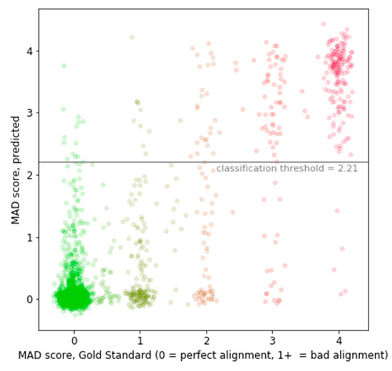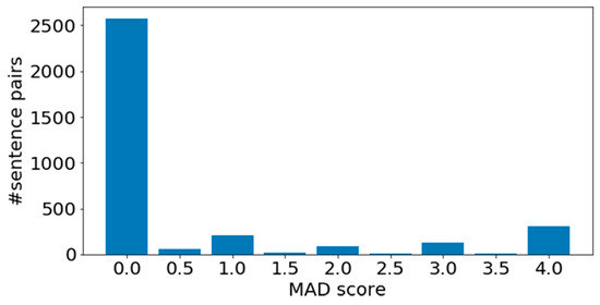 In this work, we combined ideas introduced in References [6,7,8,9,10,11] to build a model for misalignment detection. Our work is different than previous studies, as we reformulated the problem of misalignment detection as a supervised regression task, rather than a (unsupervised) classification task. Therefore, we introduced a misalignment detection score (MAD score) and labeled a dataset consisting of parallel and divergent sentence pairs accordingly.