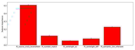 From Table 5 it is clear that the shallow features contain much less information than those obtained after a translation step. To get some more insight about the importance of each feature when combined with others, we also fitted a Random Forest Regression model (with a maximum depth of 10 to avoid overfitting) to the training data and calculated how much each feature decreased the weighted variance in a tree (see Figure 4). As our features are correlated (we refer to Appendix C), these results are somewhat biased, though they are still in line with the results shown in Table 5. Note that the Levenshtein distance between the source and the translation of the target in the source language was also considered as a feature (i.e., Ft_target_cross_levenshtein). However, its importance was comparable to the feature Ft_source_cross_levenshtein, and due to the high correlation of these features and because it would involve another translation step, it was not withheld.