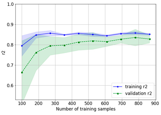 Next we used the calculated features to train a Support Vector Regression model. We used 5-fold cross-validation to tune the hyper-parameters and found that a Radial Basis Function with C = 10, γ = 0.19, and ε = 0.1 gave the best performance. A Random Forest Regression model was also considered; however, its performance was slightly worse. In Figure 5, we show the learning curve, where we show training and validation R2 for different sizes of the balanced training set. We observed that training and validation R2 converge for an increasing number of training samples, which indicates that our model does not show clear signs of over- or underfitting, and that the model would not benefit much from adding extra data to our training set.