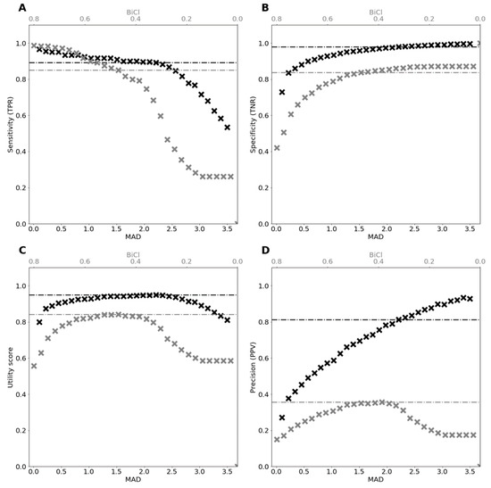 Evaluation of our model (MAD) on a held-out test set (2540 sentence pairs, 10% misaligned sentences) from the labeled dataset for misalignment detection described in Section 2.1. Black crosses show performance for various thresholds of MAD; gray crosses show performance for various BiCleaner thresholds. Note that a misalignment is considered a positive label. Horizontal, dotted black and gray lines show performance for MAD resp. BiCleaner thresholds for which the utility score is maximal. (A) Sensitivity for various MAD (black, lower x-axis) and BiCleaner (gray, upper x-axis) thresholds. (B) Specificity. (C) Utility score. (D) Precision.
