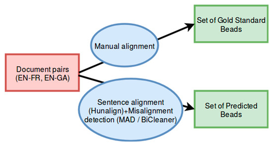 For the creation of the set of gold standard beads, we manually sentence aligned 13 document pairs for EN–FR and 11 document pairs for EN–GA (we refer to Section 2.5). To obtain the set of predicted beads, we initially sentence aligned the document pairs, using Hunalign, after which MAD or BiCleaner were run on these alignments. We also refer to Figure 8 for an illustration of our adopted methodology.
