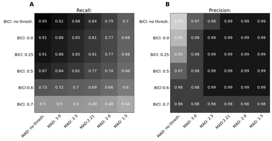 Evaluation of gold standard (EN–GA) for various BiCleaner and MAD thresholds. The first row shows recall/precision when no threshold is set for BiCleaner, the first column shows recall/precision when no threshold is set for MAD. (A) Recall. (B) Precision.