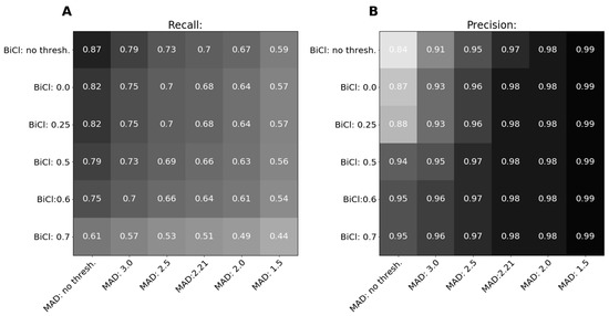 Evaluation on gold standard (EN–GA) for various Hunalign and MAD thresholds. The first row shows results when no threshold is set for Hunalign, and the first column shows results when no threshold is set for MAD. (A) Recall. (B) Precision.