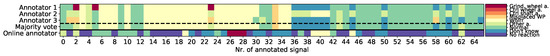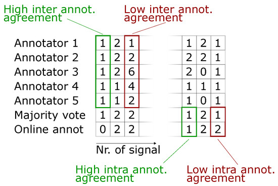 - For a better understanding, different scenarios of inter- and intra-annotator agreement are visualized in Figure 2. Here, retrospective annotators 1 to 5 are shown the signals proposed as anomalous during online annotation (bottom row) for a second review. We can judge inter-annotator agreement from these 5 annotations per proposed signal. The majority vote found from these 5 annotations per signal is depicted in row 6 and allows for comparison of retrospective annotations to the online annotations in row 7. This in turn allows for specifying an intra-annotator agreement, i.e., consistency between both labeling periods for each signal proposed as anomalous.