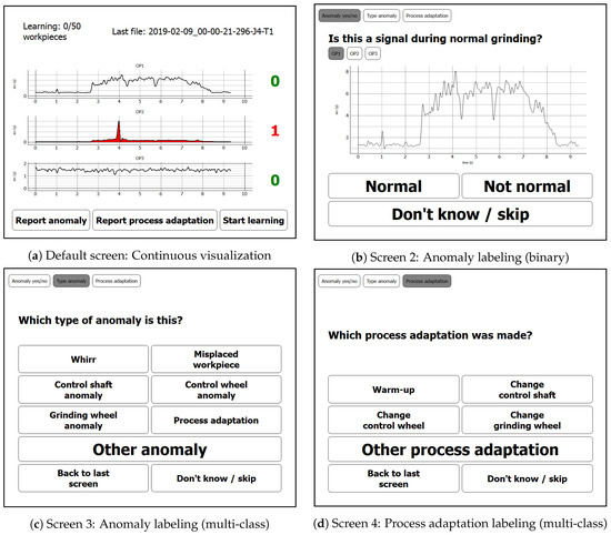 - In order to define an initial version of the labeling prototype screen design, we had a first meeting with the machine adjuster. In this meeting, we proposed and adapted a first version of the labeling prototype design. Additionally, we discussed the most accustomed way for presentation of sensor data: Industrially established solutions typically depict the envelope signals rather than the raw sensor data, TFD representations or feature scores. We thus chose the similar, well-known form of signal representation. Finally, we discussed the most frequent anomaly types and process adaptations to be included as dedicated class label buttons (screens 3 and 4 in Figure 4).