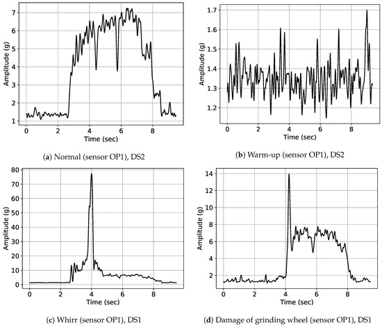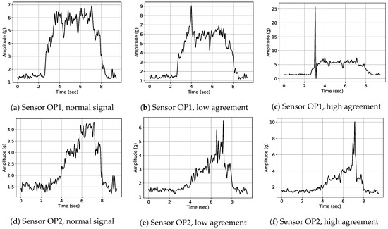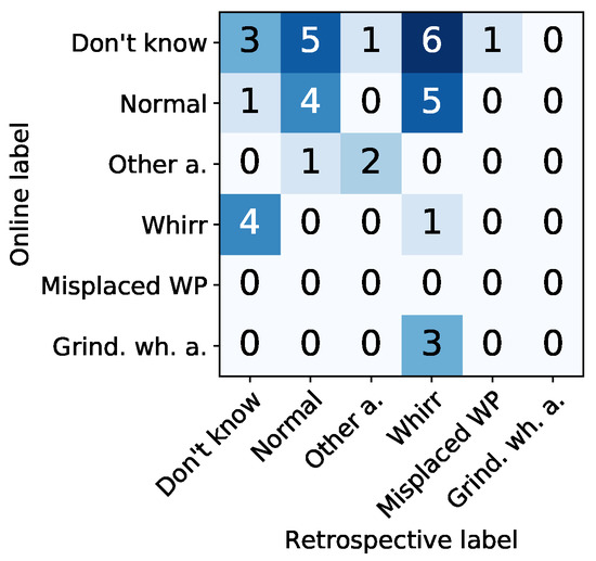 - Reliability of retrospective annotations (Assumption 3a): Retrospective annotations illustrated high inter-annotator agreement especially for the class “Whirr” (cf. Figure 10). This confirms high reliability of retrospective labels especially for this anomaly class. Furthermore, signal examples illustrated in Figure 11 visually confirm that signals with high inter-annotator agreement were clearly identifiable as signal outliers and depict a typical “Whirr” signal pattern. On the other hand, examples with low inter-annotator agreement were characterized by more subtle deviations.