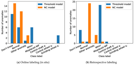 - Dependency of online label feedback on types of anomaly (Assumption 1): Clear anomaly types (whirring workpieces, grinding wheel damages) were more often confirmed and typically proposed by the threshold model, whereas other subtle anomalies were confirmed more seldom in general and typically proposed by the NC model (cf. Figure 7).