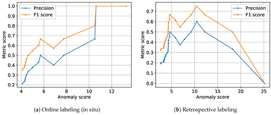 - Dependency of label feedback on height of anomaly scores (Assumption 2a): Higher anomaly scores for anomaly propositions of the NC model resulted in higher precision and F1 scores (cf. Figure 8). We interpret this to be due to clearer signal deviations that were better observable by the human operator, resulting in more certain and thus reliable online label feedback. This dependency was more clearly observable for live annotations than for retrospective annotations.