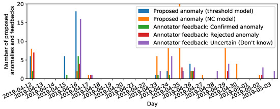 - Dependency of online label feedback on time (cf. Assumption 2b): High amounts both of anomaly propositions and online label feedback clustered at days of visually confirmed machine damages (cf. Figure 9). This verifies the sensibility of anomaly propositions and reliability of online label feedback at these days. Furthermore, we observed a “calibration” phase of users getting accustomed with the labeling prototype where the labeling behavior of users changed from tending to reject anomaly propositions to reacting with labeling signals as uncertain (“Don’t know”). We interpret this latter finding as increased trust of human annotators in anomaly propositions prompted via the labeling prototype.