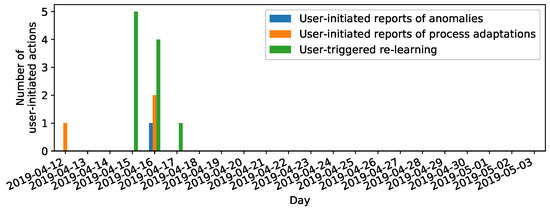 - A high degree of user-initiated actions for days with visually confirmed anomalies, as we assume a higher necessity of process adaptations after confirmed anomalies and higher necessity of reporting anomalies missed by the anomaly detection model at clusters of abnormal machine behavior (Assumption 5). This degree can be measured by the number of clicks of any of the buttons for user-initiated actions on our visualization and labeling prototype (cf. Figure 4a and buttons “Report anomaly”, “Report process adaptation”, and “Start learning”).