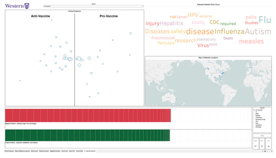 Online debates, specifically the ones about public health issues (e.g., vaccines, medications, and nutrition), occur frequently and intensely, and are having an impact on our world [1,2,3,4]. Many public health topics are debated online, one of which is the efficacy and morality of vaccines [5,6]. When people examine such online debates, they encounter numerous and conflicting sources of information [7]. This information forms the basis upon which people take a position on such debates. This has profound implications for public health. It necessitates a need for public health stakeholders to be able to examine online debates quickly and effectively. They should be able to easily perform sense-making tasks on the vast amount of online information, such as sentiments, online presence, focus, or geographic locations. Sense-making is an activity in which a user gradually develops a mental model of an information space (e.g., an online debate) about which they have insufficient knowledge [8,9]. A sense-making activity is usually comprised of a set of tasks, some of which include: scanning the information space, selecting relevance of items, and examining them in greater detail [10]. Visual analytic systems (VASes) can help with these sense-making tasks.