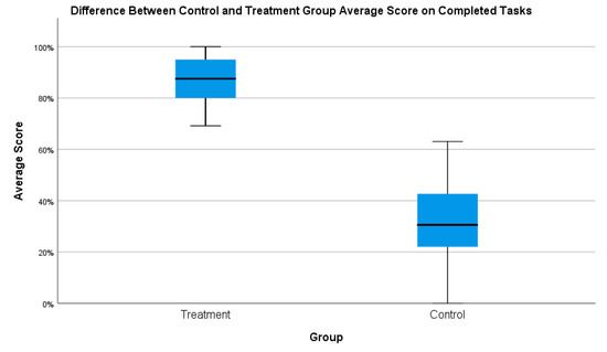 With regard to the average score (for only the completed tasks), at a descriptive level, the treatment group greatly outperformed the control group (see Figure 3). Every participant in the treatment group outperformed every participant in the control group.
