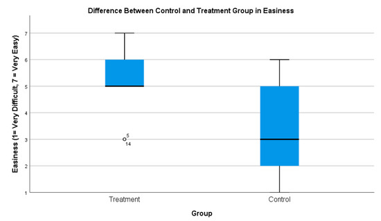 Overall, the treatment group responded much more positively to the tasks than the control group. At a descriptive level, the treatment group found the tasks much easier to complete (see Figure 4). The median response for how easy they found the tasks was, for the treatment group, easy, while for the control group it was somewhat difficult.