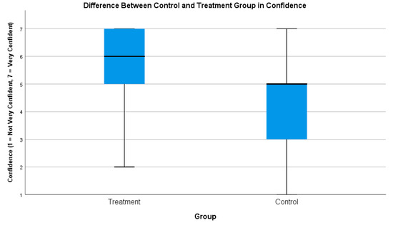 As well, at a descriptive level, the treatment group was much more confident in their responses (see Figure 5). The majority of responses from the treatment group ranged from extremely confident to somewhat confident, while for the control group, the majority of responses were somewhat confident to somewhat not confident.