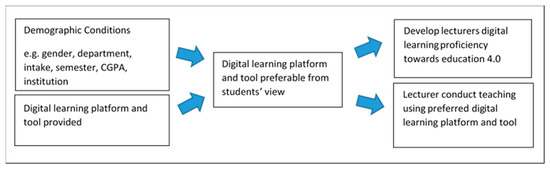 The motivation for this study was based on the discussion by [4], who stated that polytechnic lecturers are still inexperienced in education technology and have difficulty in fully utilizing information and communication technologies (ICT) in teaching. Therefore, the findings of this study can be used for polytechnic lecturers to strengthen their digital ICT proficiency practice based on the needs of future education 4.0 introduced by [5]. By this, the polytechnic lecturers need to make an informed decision about digital learning platforms and tools that could meet the students’ interests. Thus, the objective of our paper was to highlight the level of student demand towards the use of digital learning platforms and tools for lecturers strengthens the digital proficiency practice in Polytechnic Malaysia. Figure 1 showed the proposed theoretical framework of this study.