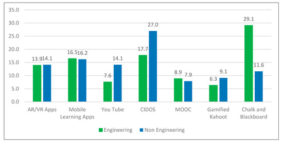 Previously, we have mentioned some challenges in our research which might influence our results. Therefore, we tried to address this problem by grouping the respondents into two groups, namely engineering and non-engineering students. As such, we have selected four departments from JP, JPH, JRKV and JTMK to represent the non-engineering students whereas another four departments from JKE, JKA, JKM and JPP represent the engineering students. The results presented in Figure 4 shows that engineering students have a higher demand for traditional methods, with 29.1% compared to others. As for non-engineering students, the CIDOS learning platform is the highest demand in the classroom, with 27%. Interestingly, we realized that the use of traditional methods among the engineering students is higher compared to non-engineering students, as only students thought it could enhance their understanding in the classroom.