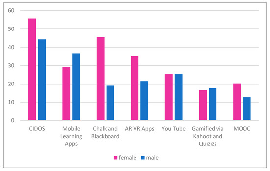Additionally, in Figure 5, we found that female students have dominated the interest in learning to use CIDOS more than male students. However, male students dominate the use of mobile apps and gamified platforms through Kahoot! and Quizizz more than females. In addition, the results also reveal that both genders have the same demand for digital learning through YouTube.