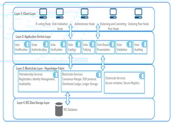 Application Service Layer: this consists of a set of services that are available in the e-voting system. The level of access control and the defined permissions level determines the type of services that a node can access in the blockchain.