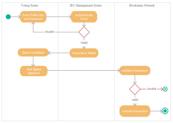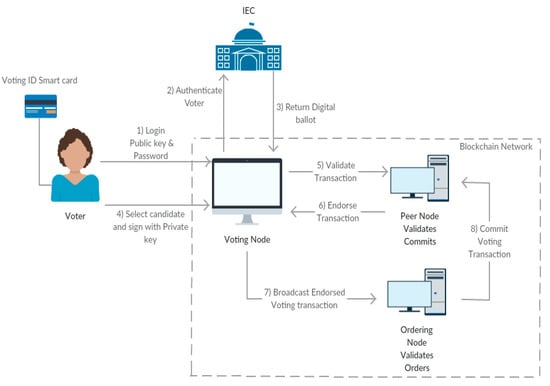 An overview of the e-voting process that is based on the blockchain architecture is presented in Figure 2.