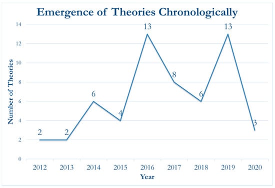 With ten (10) studies, the TOE framework and its extension constitute the most utilized innovation adoption theory/model in the open government data domain. These studies adopted, adapted, and extended TOE across various contexts. The study conducted by Yang and Wu [21] used Institutional Theory with TAM, UTAUT, and UTAUT2 and empirically analyzed the Government agencies’ intention and behavior of open data publication in Taiwan. The second most utilized theory was the institutional theory. This theory has also to be utilized by combing some other technology adoption theories such as system theory [16], and the new public management theory and the structuration theory [35]. Another five (5) studies employed this theory as a standalone theory [20,26,31,33]. The third most utilized theory was DOI theory whereby it was employed by the four researchers [7,9,20,58]. The fourth theory, which was employed mostly, was resource-based theory and it was employed three times [6,11,37]. The remaining twenty-six (30) theories were employed only once whereas some of them were used combinedly. In the domain of tourism, McNaughton and McLeod [60] analyzed the relationship among stakeholders about data exchange using the actor-network theory and highlighted the five key influencers in Jamaica’s open data initiatives. The total number of theories employed chronologically is depicted in Figure 2.