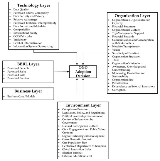 In this study, a conceptual model has been developed using the guidelines of Jeyaraj, Rottman [62]. The predictors of organizational OGD adoption behavior have been modeled based on the number of times a predictor was addressed to have its influence on OGD adoption behavior in the public sector. Besides, the more frequently addressed variables or constructs in the earlier adoption studies have been selected based on the fact that this method is well-recognized among previous studies on finding the most frequently used influencing factors within the same research area [63]. This method is also helpful in identifying varied significant, non-significant, as well as no relationships. This contributes to a collective decision in developing a hypothesis or interpreting the results [64]. Further, the method of most frequently addressed factors is suitable to highlight the gaps in the existing body of knowledge and to propose patterns for future research found during analysis [65]. This method to develop a conceptual or theoretical model was also employed because several other studies have significantly adopted it, including those of Rana and Dwivedi [63] or Rad and Nilashi [65]. To make the model concise, a predictor is modeled if it is addressed more than twice. Besides, several different factors have been integrated into five different layers, i.e., (1) technology layer, (2) organization layer, (3) environment layer, (4) benefits, barriers, risks, losses (BBRL) layer, and (5) business layer. Figure 3 shows the conceptual/theoretical model of organizational adoption of open government data.