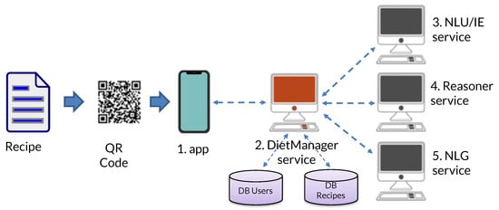 Figure 1 shows the architecture of the MADiMan system. The information flow is: (1) A user, by using an app, recovers the specific recipe of a dish (or menu) that she/he would like to eat. (2) The app, interacting with the DietManager service, retrieves the user diet together with the list of the foods the user had previously eaten. (3) The NLU/IEmodule recovers the pertinent nutrition information of the specific dish. (4) Using the user diet and the list of the foods eaten in the previous days, the Reasoner generates the final recommendation for the user concerning the proposed dish. (5) Starting from the recommendation elaborated by the Reasoner, the NLG service generates a simple explanation for the user in plain natural language. (6) The result provided by the NLG service is sent to the app by the DietManager: the user will see this final result on her/his smartphone. If the user wants to eat the dish, this information will be sent to the DietManager by the app, and the list of eaten food will be updated.