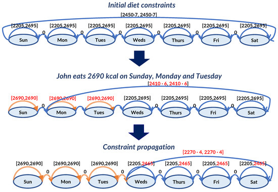 Graphical representation of the simple temporal problem (STP) constraints modelling a diet. For the sake of simplicity, in the figure, we do not represent the macronutrients, nor the single meals, but only the total energy in a day. In the top part, we represent the STP corresponding to the dietary constraints at the beginning of a week. In the middle part, we have the STP after the first three days, where John ate 2690 kcal on each day; notice that also imprecision in the measurement is supported [12]. In the bottom part, we represent the STP resulting from the constraint propagation where—as a result of food eaten in the first three days—John has to eat between 2205 kcal and 2465 kcal each day for the rest of the week and a total in the remaining four days of kcal.