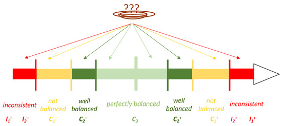 Using the minimal network resulting from the constraint propagation on the STP, where, for each meal and for each macronutrient, a lower and upper bound is provided (see Section 3.2), we classify the proposed meal with regard to the diet into: permanently inconsistent (), provisionally inconsistent (), consistent, but not balanced (), consistent and well-balanced () and consistent and perfectly balanced ().