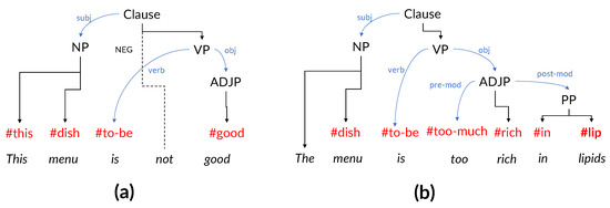 Two quasi-trees corresponding to specific messages on (a) proteins and (b) carbohydrates and the corresponding realized sentences.