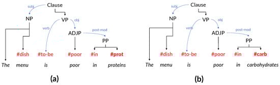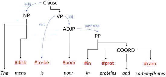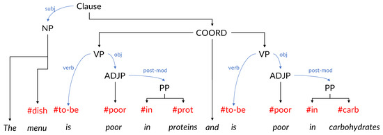 In order to pursue the persuasive goals of the system, we implemented and tested two different strategies for merging the specific messages concerning the macronutrients. Among the possible mechanisms available to merge two sentences, i.e., simple conjunction, conjunction via shared participants, conjunction via shared structure and syntactic embedding [43], our system supports all of them but syntactic embedding. We experimentally compare (see Section 4) the conjunction via shared structure on the VP constituent (VP-aggregation) and on the NP contained in the prepositional phrase (set-aggregation). For example, taking into account the sentences (i) “The menu is poor in proteins” (Il menù è povero in proteine (see Figure 5a)) and (ii) “The menu is poor in carbohydrates” (Il menù è povero in carboidrati (see Figure 5b)), the VP-aggregation generates the sentence “The menu is poor in proteins and is poor in carbohydrates” (Il menù è povero in proteine ed è povero in carboidrati (see Figure 6)), while the set-aggregation generates “The menu is poor in proteins and in carbohydrates” (Il menù è povero in proteine e carboidrati (see Figure 7)).