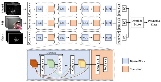 Figure 1. Overview of the proposed multimodal architecture using a triple input (infrared, RGB and depth streams). Each branch is composed of a modified version of the DenseNet-161 [22] architecture, which combines a sequence of dense and transition blocks. The input is a stream of images from different modalities and the predictions of the three networks are combined with a late-fusion approach to obtain the predicted gesture. - We test the proposed method on two public datasets, namely Briareo [20] and Nvidia Dynamic Hand Gesture [21] (here also referred as NVGestures). Results in terms of accuracy and confusion matrices confirm the high level of accuracy achieved, enabling the implementation of real-world human–car interaction application. We also report the computational performance.