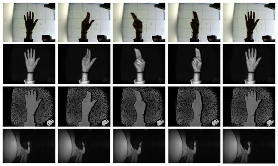 Sample frames of the dataset captured with the two acquisition devices are shown in Figure 2. The frames acquired with the RGB camera and with the Pico Flexx device are reported in the first three rows, while the acquisition of the right camera of the Leap Motion sensor is reported in the last one.
