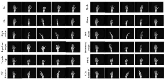 Dynamic gesture classes contained in the Briareo dataset. All gestures are designed for the interaction between an user, i.e., the driver, and a traditional infotainment system, in which it is possible for instance skipping song (“right/left swipes”) or make a phone call (“phone”). Here, frames are taken from the infrared domain. Image taken from [20].