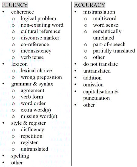 - Tezcan, A.; Hoste, V.; Macken, L. SCATE taxonomy and corpus of machine translation errors. In Trends in E-Tools and Resources for Translators and Interpreters; Pastor, G.C., Durán-Muñoz, I., Eds.; Approaches to Translation Studies; Brill | Rodopi: Leiden, The Netherlands, 2017; Volume 45, pp. 219–244. [Google Scholar]