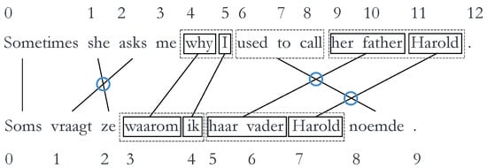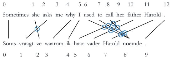 Syntactic divergence can be quantified through various different metrics. We will briefly explain these metrics so they can be interpreted correctly during the discussion of the results; however, for a more thorough explanation, we refer to the works of Vanroy et al. [20,21]. The scripts used to calculate these metrics can be found at https://github.com/BramVanroy/astred. The first metric is word_cross. This examines the reordering of words necessary when comparing source to target [21]. Concretely, it is calculated by the number of times word alignment links cross each other averaged by the total number of alignment links. The word alignments between the source and target are obtained automatically by using GIZA++. In Figure 2 below, there are 12 links (indicated by arrows) and 10 crosses (indicated by circles). This means that the word_cross value is or 0.833; a fairly high score, which indicates that a large amount of word reordering, is necessary.