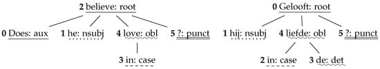 Example of the source dependency tree of ’Does he believe in love?’ (left) and the target dependency tree of its Dutch translation ’Gelooft hij in de liefde’ (right) (example sentences taken from Vanroy et al. [21]). The word alignments between the two sentences have been indicated by underlinings. In order to calculate ASTrED, the tree edit distance between these two trees is measured. (Literal translation of the Dutch sentence: * Believes he in the love?).