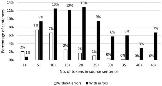 When looking at the quality of each novel separately, one novel seems to catch the eye. Sense and Sensibility only has 5% of the GNMT sentences without errors and 4% of the DeepL sentences. The other three novels hover around ±25% without errors. This may raise questions as to why Sense and Sensibility performed so poorly. As mentioned earlier in this article, Sense and Sensibility also distinguished itself from the other novels by its style and fairly long sentences. When looking at all the sentences with or without errors in the whole corpus as shown in Figure 5, we see that, on average, the longer a sentence is, the less likely it is to be error free. This is also confirmed in previous research, and longer sentences are simply more difficult for NMT to translate [28,29,30]. The aforementioned observation could also indicate that there is a possible relation between authorial style and quality of NMT.