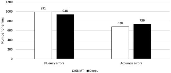In order to discover the most problematic errors for literary NMT, we took a look at the most frequent errors’ types. Similar to previous research on English to Dutch NMT [4,5,13], our data set contains more fluency errors (1,929) than accuracy errors (1414). In total, GNMT makes 1669 errors, 991 of which are fluency (59%) and 678 accuracy (41%); DeepL makes 1674 errors, 938 of which are fluency (56%) and 736 accuracy (44%) (Figure 6). This would seem to indicate that GNMT struggles more with fluency errors than DeepL and DeepL more with accuracy errors than GNMT, but more research would be needed to substantiate this claim further.
