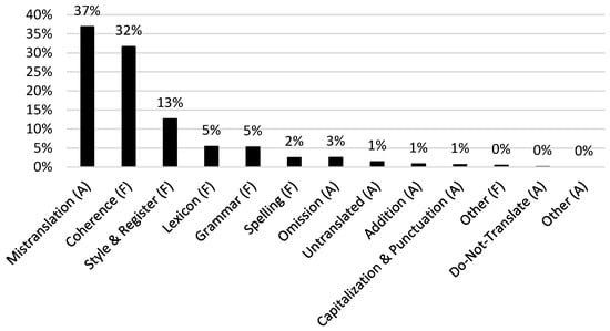 Frequency distributions of error types expressed as percentage of all errors (from all four novels and both NMT systems).