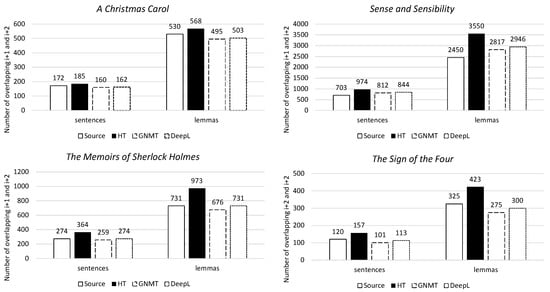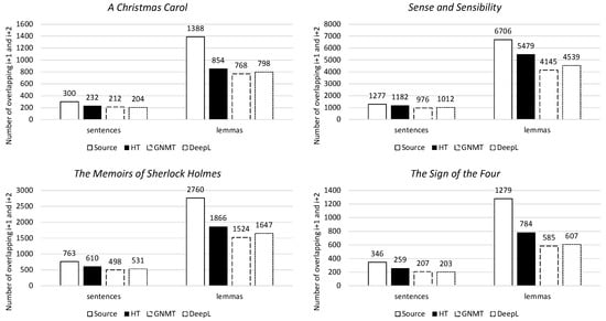 Firstly, lexical cohesion indicates the overlaps created by identical words in sentence i, sentence i+1, and sentence i+2. For all four novels, the human translation has the highest lexical cohesion, both on the sentence and lemma levels. The machine translation has a level of lexical cohesion that is much lower than that of the human translation. Its level of lexical cohesion more closely resembles that of the source text (Figure 8).