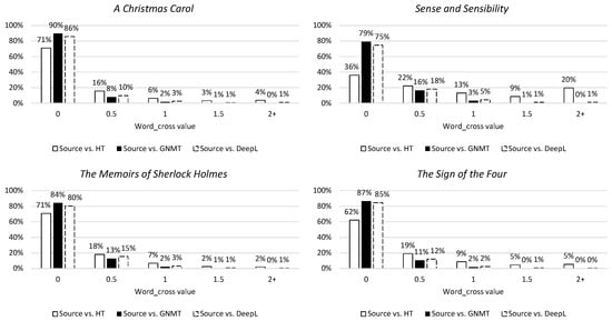 Table 5 clearly shows that the number of unique words in the human translations always exceeds the number of unique words in the machine translations (e.g., A Christmas Carol has 4260 unique words in the ST, 5064 in HT, 4799 in the GNMT and 4804 in the DeepL). This would seem to indicate that human translations tend more strongly towards lexical richness than machine translations. This is confirmed by Vanmassenhove et al. [10], who state that MT causes a loss in terms of lexical richness and diversity when compared to a human-generated or human-translated texts. An interesting illustration of this decline of lexical richness can be found in Sense and Sensibility. In the source text, the adjective ‘charming’ appears 17 times; both GNMT and DeepL use the fairly evident translation ‘charmant’ 17 times, whereas the human translation uses 14 different formulations, remarkably none of which is the ‘evident’ ‘charmant’ Other examples of human translations of ‘charming’ are: ‘schattig’ (x1), ‘allerliefst’ (x4), ‘riant’ (x1), ’lief’ (x1), ’oergezellig’ (x1), ’dol’ (x1), ‘innemend’ (x1), ‘fijn’ (x1), ‘heerlijk’ (x1), ‘betoverend’ (x1), etc.